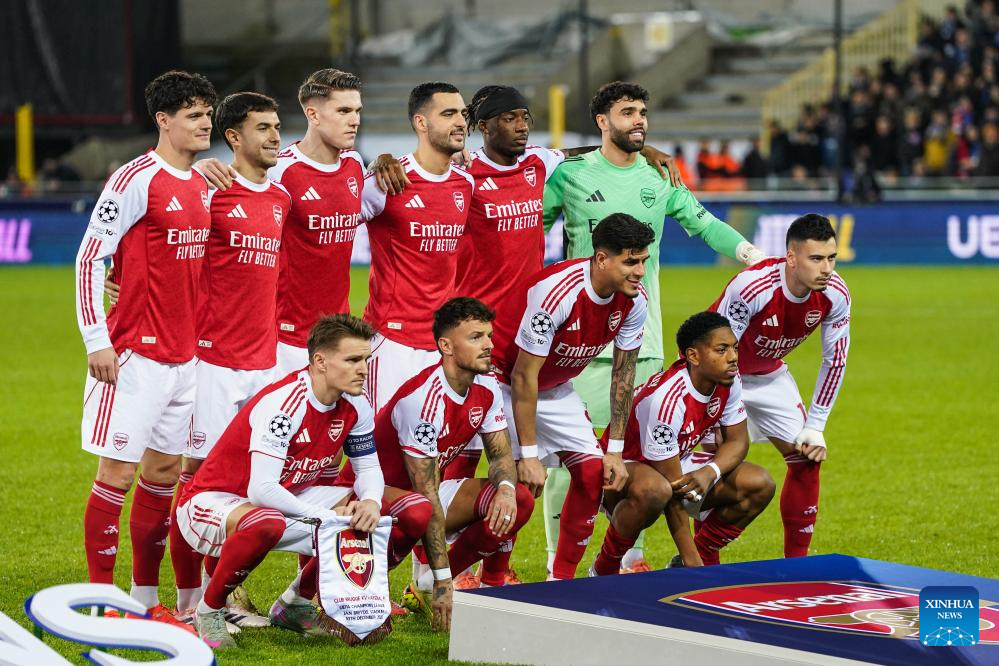 Players of Arsenal pose for a group photo before the UEFA Champions League football match between Club Brugge and Arsenal in Bruges, Belgium, on Dec. 10, 2025. (Xinhua/Peng Ziyang)
