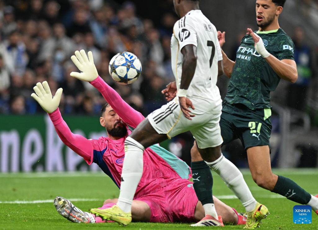 Gianluigi Donnarumma (L), goalkeeper of Manchester City, makes a save during the UEFA Champions League football match between Real Madrid and Manchester City in Madrid, Spain, Dec. 10, 2025. (Xinhua/Cheng Min)