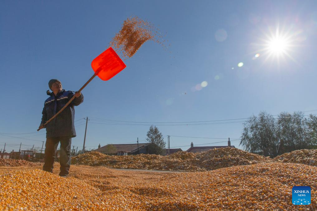 A farmer airs corn kernels in Dayushu Town of Jiamusi City, northeast China's Heilongjiang Province, Oct. 23, 2025. Heilongjiang Province, a major grain producer in northeast China, saw its 22nd bumper harvest with a record-breaking grain output reaching 82 million tonnes this year, data from the National Bureau of Statistics (NBS) showed on Friday.