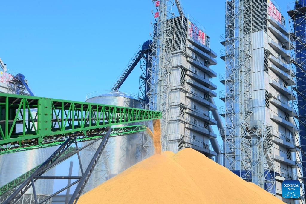 A conveyor belt transports grain at a grain storage company in Tangyuan County, northeast China's Heilongjiang Province, Nov. 12, 2025. Heilongjiang Province, a major grain producer in northeast China, saw its 22nd bumper harvest with a record-breaking grain output reaching 82 million tonnes this year, data from the National Bureau of Statistics (NBS) showed on Friday.