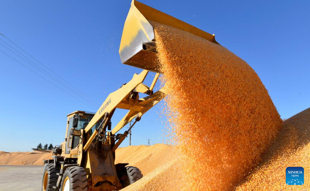 A staff member operates a shovel loader to arrange dried corn kernels at a factory of a farming company under Beidahuang Group in northeast China's Heilongjiang Province, Oct. 23, 2025. Heilongjiang Province, a major grain producer in northeast China, saw its 22nd bumper harvest with a record-breaking grain output reaching 82 million tonnes this year, data from the National Bureau of Statistics (NBS) showed on Friday. After surpassing 80 million tonnes in total grain production in 2024, Heilongjiang has once again topped the record this year, marking its 16th straight year as the top grain-producing region in China, according to the provincial agriculture and rural affairs department. (Photo by Lu Wenxiang/Xinhua)