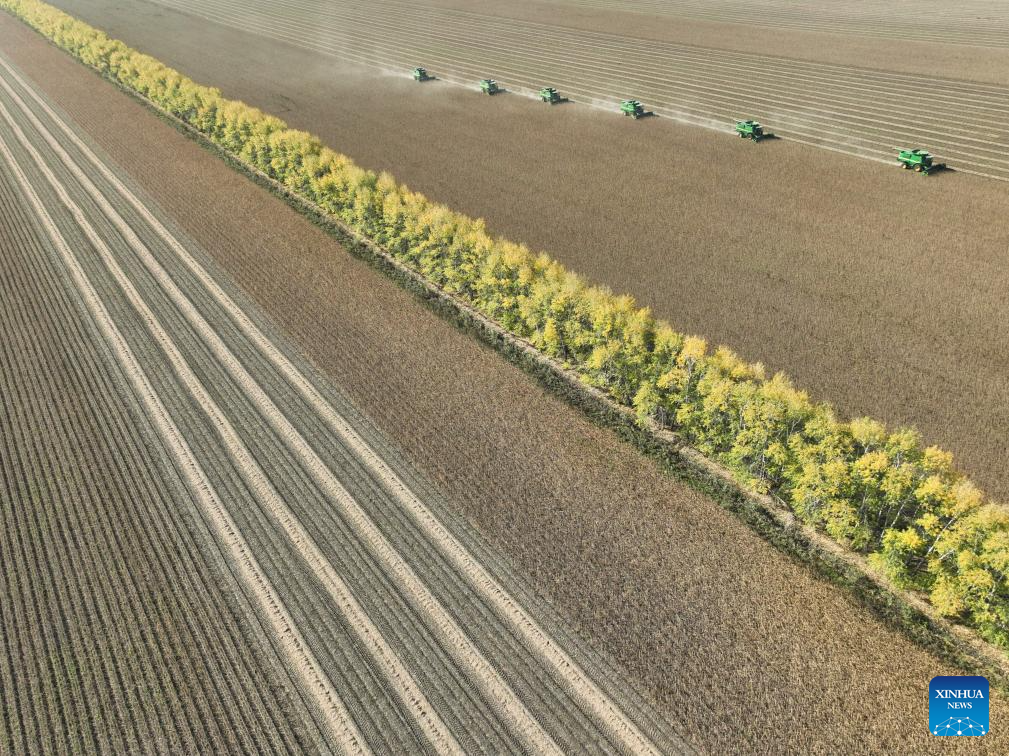 An aerial drone photo shows harvesters working at a soybean field of a farming company under Beidahuang Group in northeast China's Heilongjiang Province, Sept. 30, 2025. Heilongjiang Province, a major grain producer in northeast China, saw its 22nd bumper harvest with a record-breaking grain output reaching 82 million tonnes this year, data from the National Bureau of Statistics (NBS) showed on Friday.