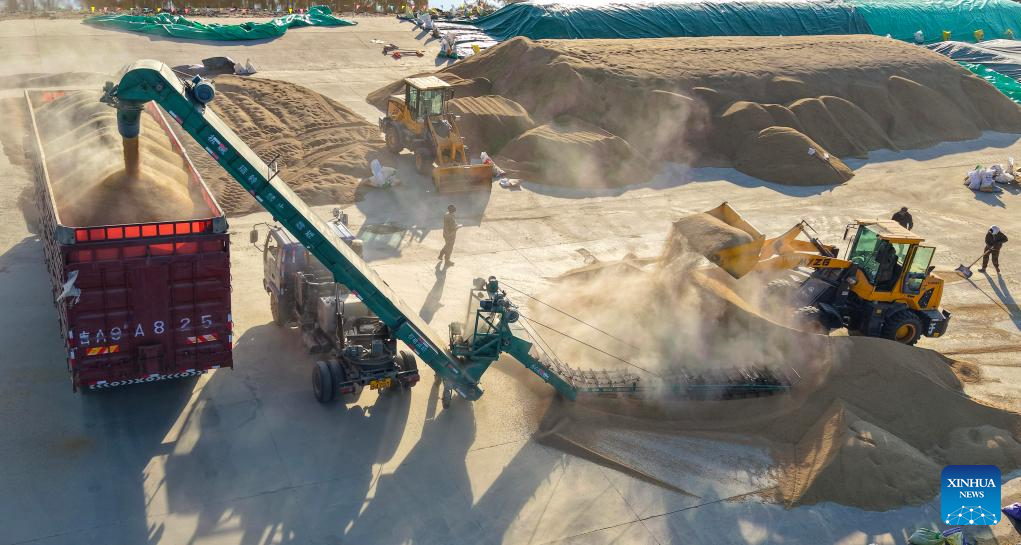 An aerial drone photo shows a shovel loader loading grain for sorting out process at a trade center of a farming company under Beidahuang Group in northeast China's Heilongjiang Province, Oct. 14, 2025. Heilongjiang Province, a major grain producer in northeast China, saw its 22nd bumper harvest with a record-breaking grain output reaching 82 million tonnes this year, data from the National Bureau of Statistics (NBS) showed on Friday.