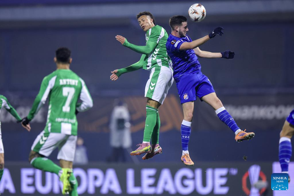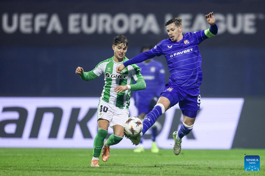 Angel Ortiz (L) of Real Betis and Miha Zajc of Dinamo compete for the ball during the UEFA Europa League 2025/26 League Phase match between GNK Dinamo and Real Betis in Zagreb, Croatia, on Dec. 11, 2025. (Sanjin Strukic/PIXSELL via Xinhua)
