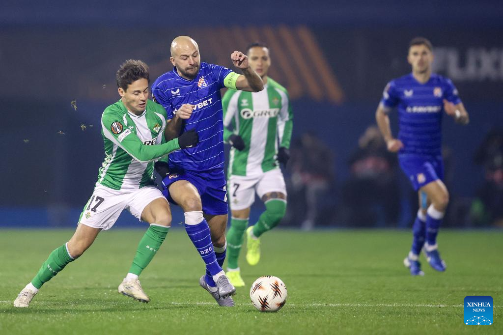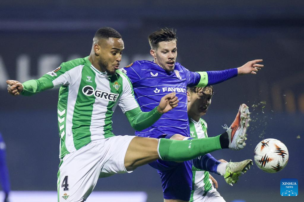 Rodrigo Riquelme (L) of Real Betis and Josip Misic of Dinamo compete for the ball during the UEFA Europa League 2025/26 League Phase match between GNK Dinamo and Real Betis in Zagreb, Croatia, on Dec. 11, 2025. (Sanjin Strukic/PIXSELL via Xinhua)