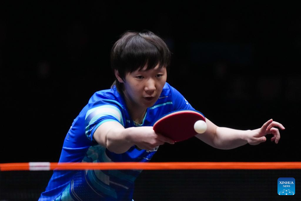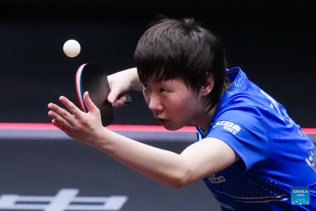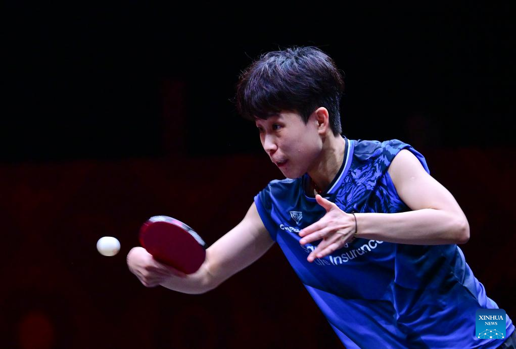 Joo Cheonhui of South Korea hits a return during the women's singles quarterfinal match against Wang Manyu of China at the WTT Finals Hong Kong 2025 in Hong Kong, south China, Dec. 12, 2025. (Xinhua/Zhu Wei)
