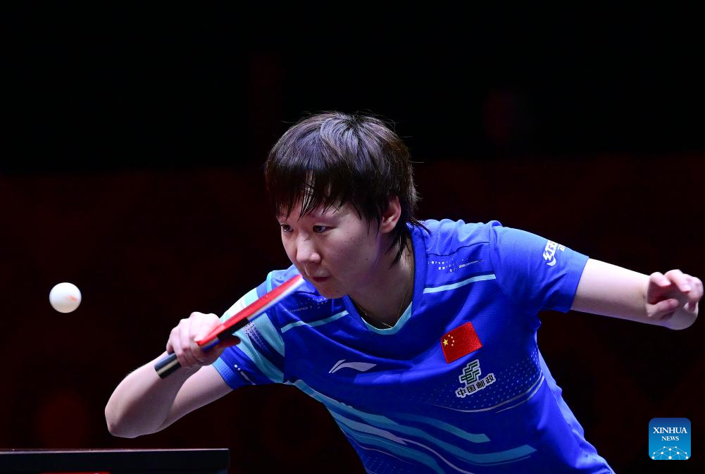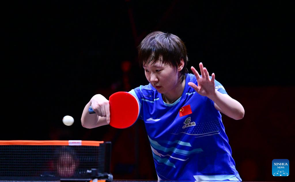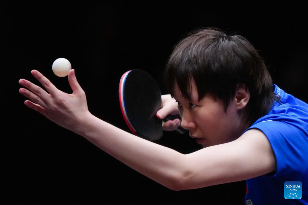 Wang Manyu of China hits a return during the women's singles quarterfinal match against Joo Cheonhui of South Korea at the WTT Finals Hong Kong 2025 in Hong Kong, south China, Dec. 12, 2025. (Xinhua/Zhu Wei)