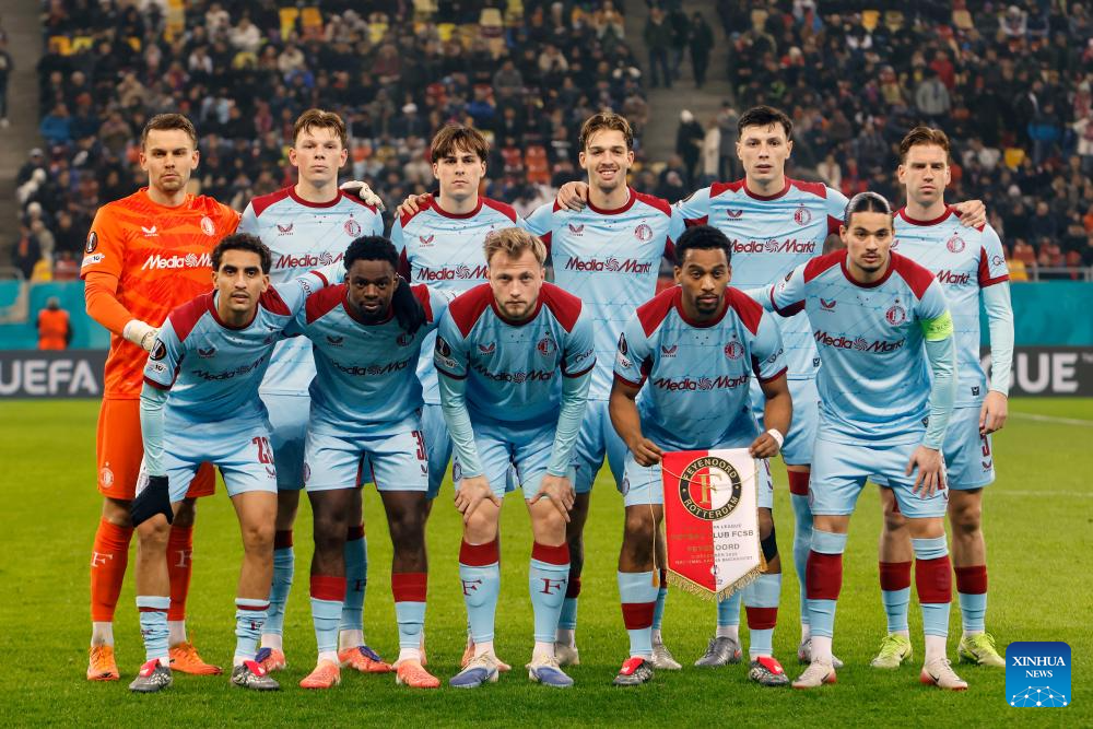 Feyenoord's starting players pose before the UEFA Europa League football match against FCSB in Bucharest, Romania, Dec. 11, 2025. (Photo by Cristian Cristel/Xinhua)