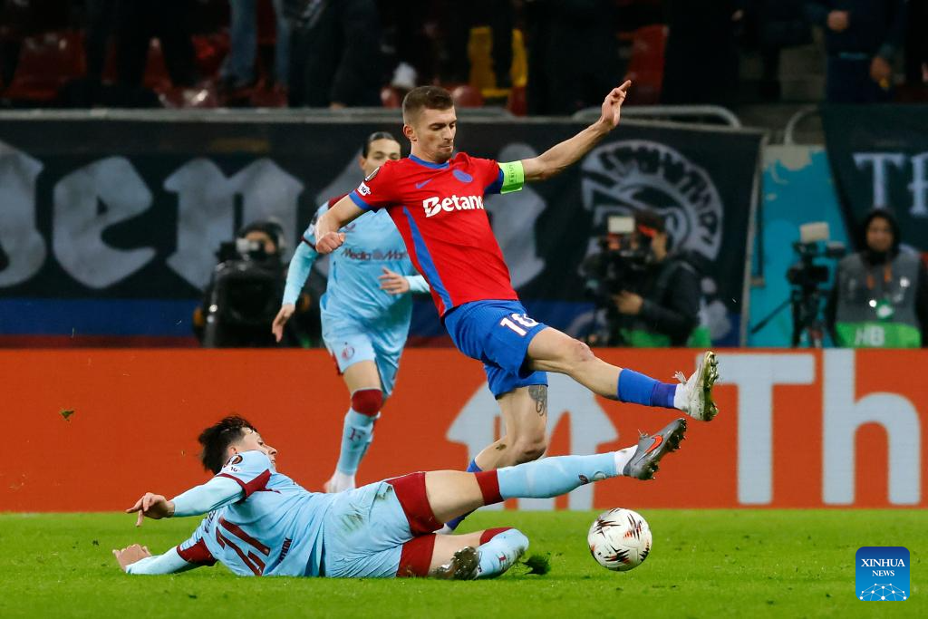 FCSB's Florin Tanase (R) vies with Feyenoord's Anel Ahmedhodzic (bottom) during the UEFA Europa League football match between FCSB and Feyenoord in Bucharest, Romania, Dec. 11, 2025. (Photo by Cristian Cristel/Xinhua)