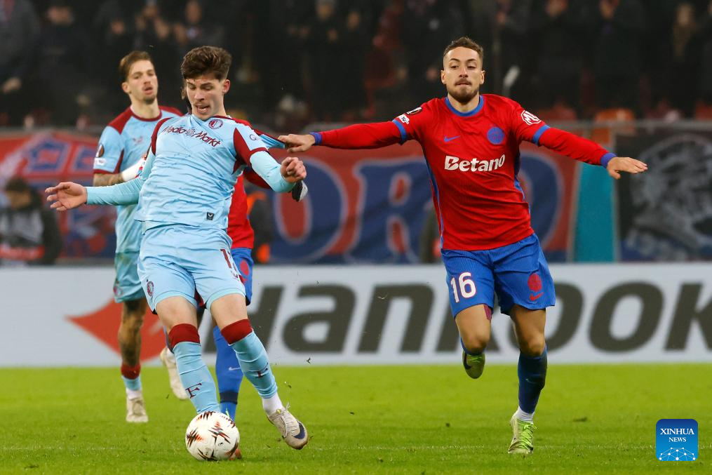 FCSB's Mihai Lixandru (R) vies with Feyenoord's Jordan Bos (front L) during the UEFA Europa League football match between FCSB and Feyenoord in Bucharest, Romania, Dec. 11, 2025. (Photo by Cristian Cristel/Xinhua)