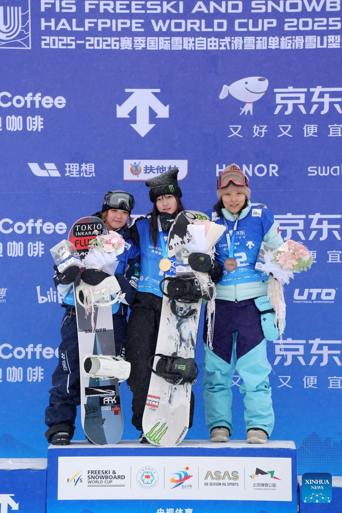 Gold medalist Choi Gaon (C) of South Korea, silver medalist Kudo Rise (L) of Japan and bronze medalist Cai Xuetong of China pose for photos during the awarding ceremony for the women's snowboard halfpipe final of FIS Snowboard World Cup 2025 in Zhangjiakou, north China's Hebei Province, Dec. 12, 2025. (Xinhua/Wang Peng)