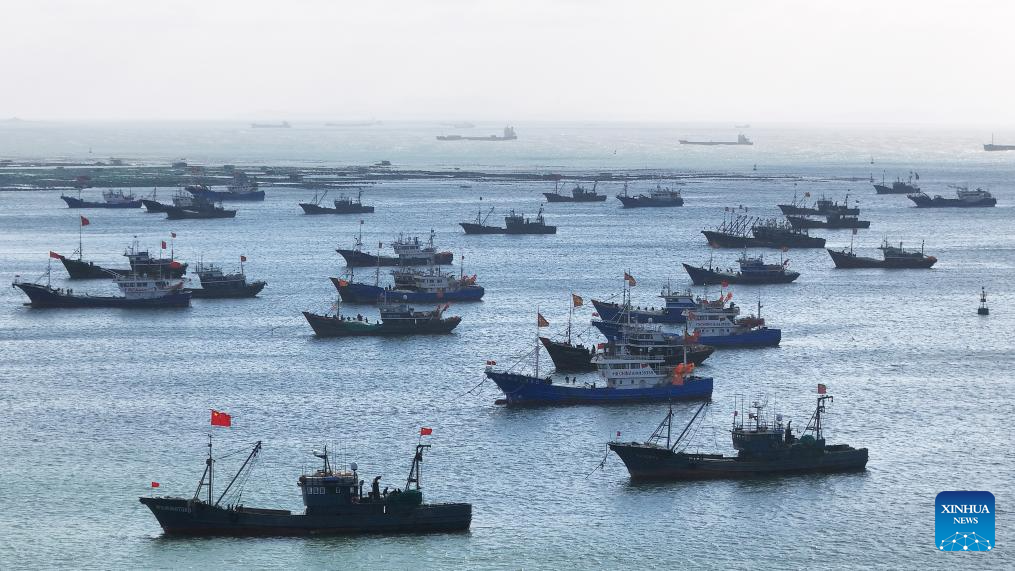 An aerial drone photo shows fishing boats berthed at Jimiya fishing port in Xihai'an (West Coast) New Area in Qingdao, east China's Shandong Province, Dec. 11, 2025.