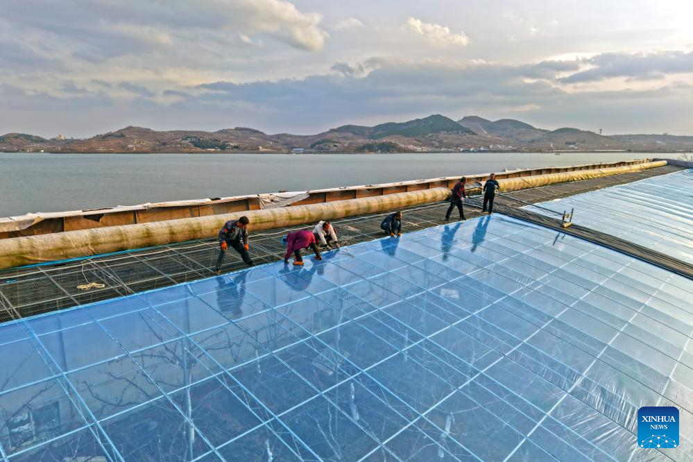 A drone photo shows farmers renewing plastic film for cherry greenhouses in Fushan District of Yantai, east China's Shandong Province, Dec. 11, 2025.