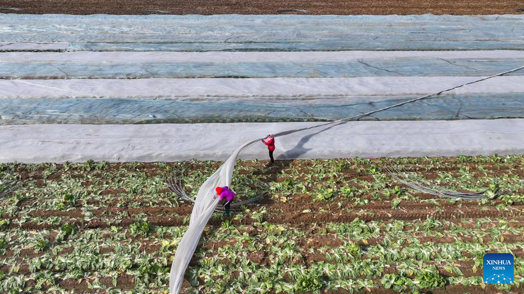 Farmers cover crops with non-woven fabric for frost protection in Guangrao County of Dongying City, east China's Shandong Province, Dec. 11, 2025.