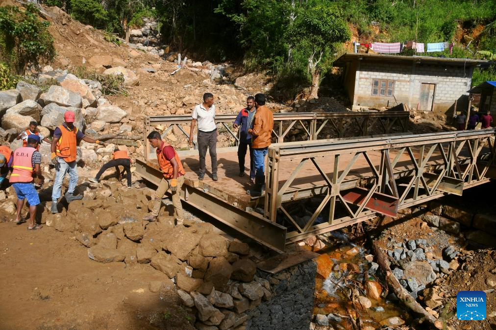 People repair a collapsed bridge affected by Cyclone Ditwah in Badulla District, Sri Lanka, Dec. 13, 2025. According to Sri Lanka's Disaster Management Center, the country recently suffered severe damage due to the extreme weather triggered by Cyclone Ditwah, which left more than 600 people dead, affected more than 2 million people, destroyed more than 4,000 houses and partially damaged more than 60,000 houses nationwide. (Photo by Ajith Perera/Xinhua)