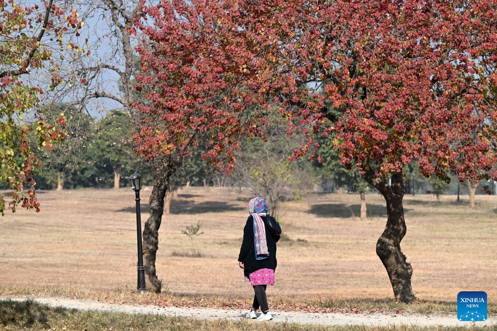 This photo taken on Dec. 12, 2025 shows a girl enjoying the winter scenery at the Fatima Jinnah Park in Islamabad, capital of Pakistan. (Xinhua/Ahmad Kamal)