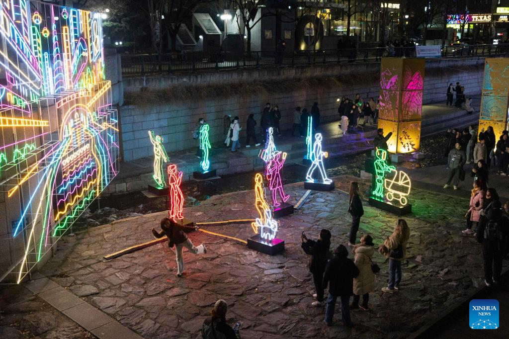 People view light installations of the 2025 Seoul Winter Festa at the Cheonggye stream in Seoul, South Korea, Dec. 12, 2025. (Photo by Jun Hyosang/Xinhua)