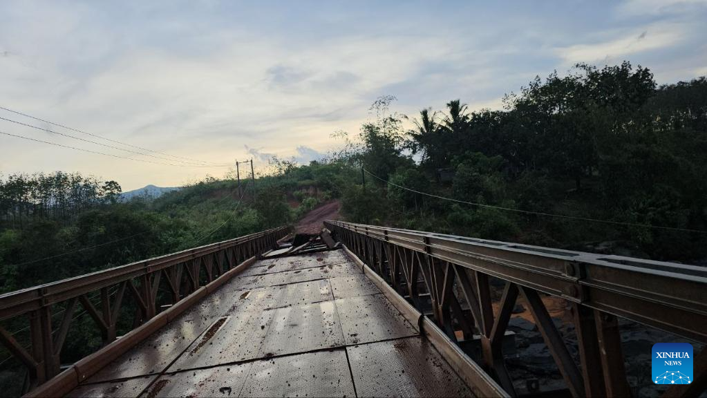 A bridge damaged during airstrikes by Thai military forces is seen in Pursat province, Cambodia, Dec. 13, 2025. The Thai military forces on Saturday morning used two F-16 fighter jets to drop bombs at some locations in Cambodia's Pursat province, the Cambodian defense ministry said in a press release. (Cambodian Defense Ministry/Handout via Xinhua)
