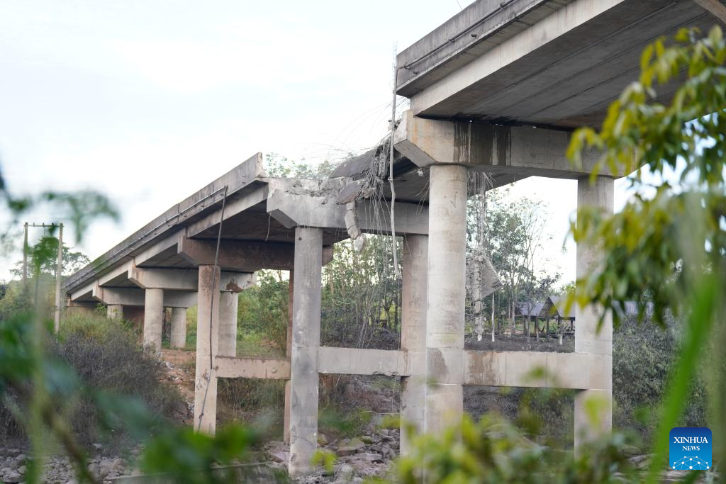 A bridge damaged in airstrikes by Thai military forces is seen in Pursat province, Cambodia, Dec. 13, 2025. The Thai military forces on Saturday morning used two F-16 fighter jets to drop bombs at some locations in Cambodia's Pursat province, the Cambodian defense ministry said in a press release. (Agence Kampuchea Presse via Xinhua)