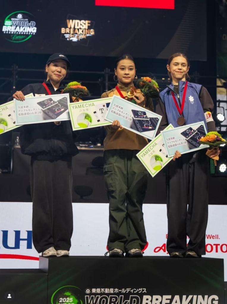 In the championship battle against 42-year-old veteran Ayumi Fukushima (B-Girl Ayumi), Guo displayed remarkable composure and consistency, controlling the contest with explosive power moves and dense footwork to secure the title. Lithuania's Dominika Banevic (B-Girl Nicka) took third place.