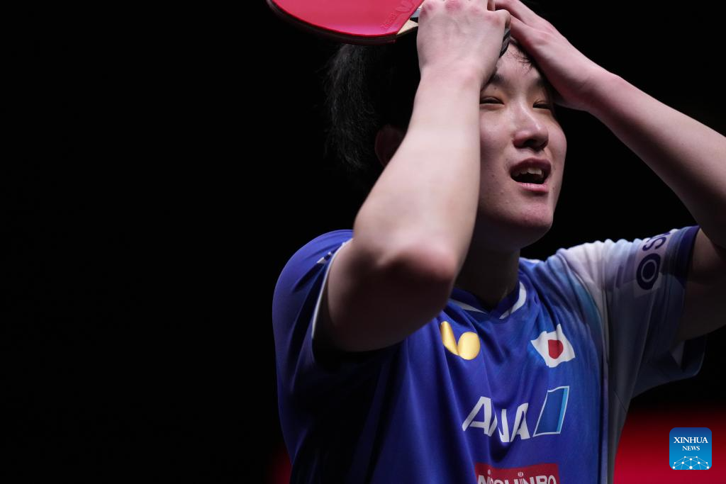 Wang Chuqin (C)/Sun Yingsha (R) of China react during the mixed doubles quarterfianl match between Wang Chuqin/Sun Yingsha of China and Matsushima Sora/Harimoto Miwa of Japan at the WTT Finals Hong Kong 2025 in Hong Kong, south China, Dec. 13, 2025. (Xinhua/Lui Siu Wai)