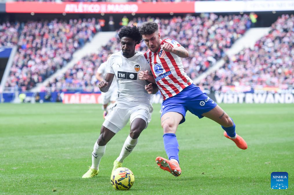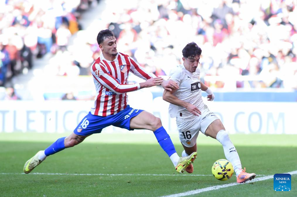 Atletico de Madrid's Antoine Griezmann (L) controls the ball during the Laliga football match between Atletico de Madrid and Valencia C.F. in Madrid, Spain, Dec. 13, 2025. (Photo by Gustavo Valiente/Xinhua)