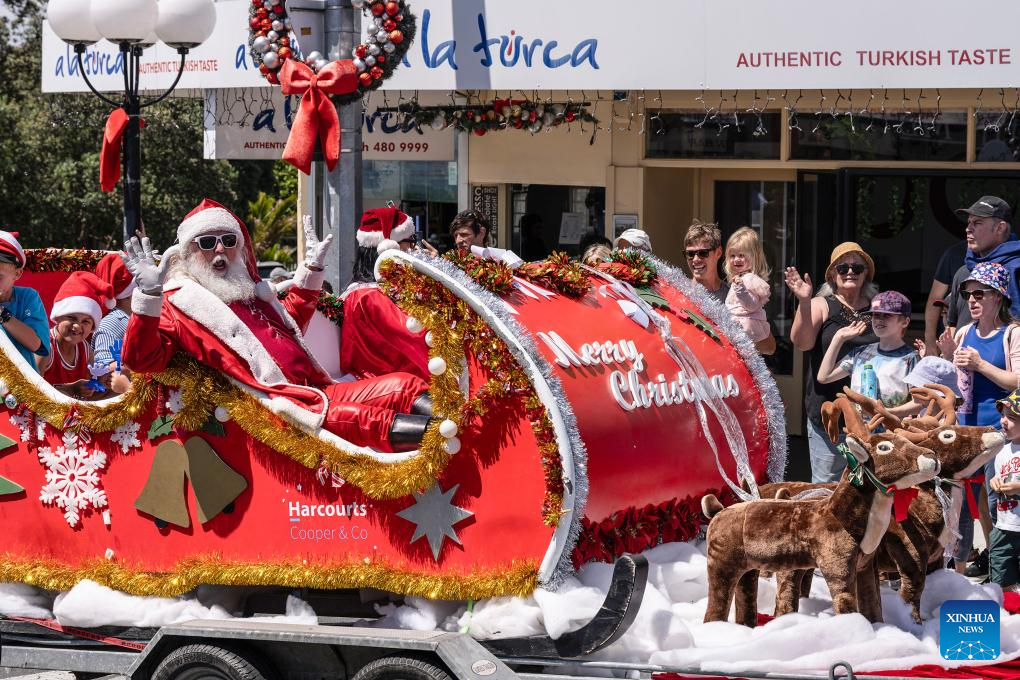 People attend a parade to celebrate the coming Christmas in Auckland, New Zealand, Dec. 14, 2025. (Photo by Wu Jiaxiang/Xinhua)