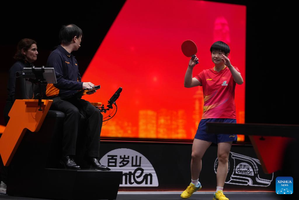 Sun Yingsha is seen during the women's singles semifinal match between Sun Yingsha of China and Kuai Man of China at the WTT Finals Hong Kong 2025 in Hong Kong, south China, Dec. 13, 2025. (Xinhua/Lui Siu Wai)