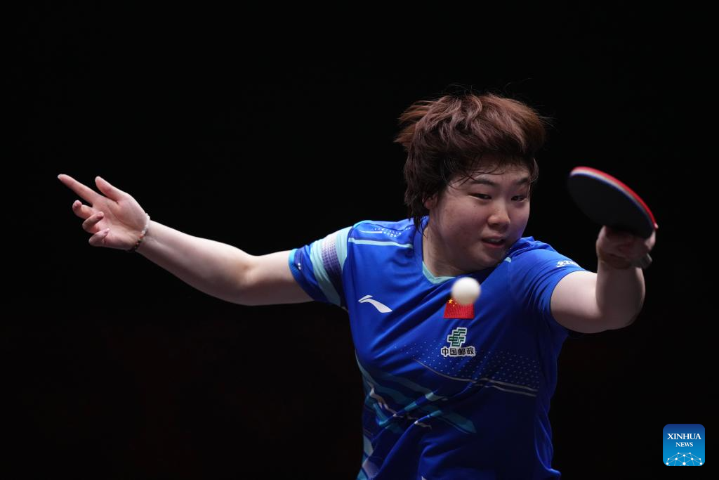 Kuai Man competes during the women's singles semifinal match between Sun Yingsha of China and Kuai Man of China at the WTT Finals Hong Kong 2025 in Hong Kong, south China, Dec. 13, 2025. (Xinhua/Lui Siu Wai)
