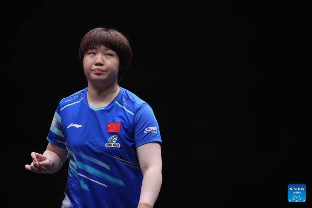 Kuai Man reacts during the women's singles semifinal match between Sun Yingsha of China and Kuai Man of China at the WTT Finals Hong Kong 2025 in Hong Kong, south China, Dec. 13, 2025. (Xinhua/Lui Siu Wai)