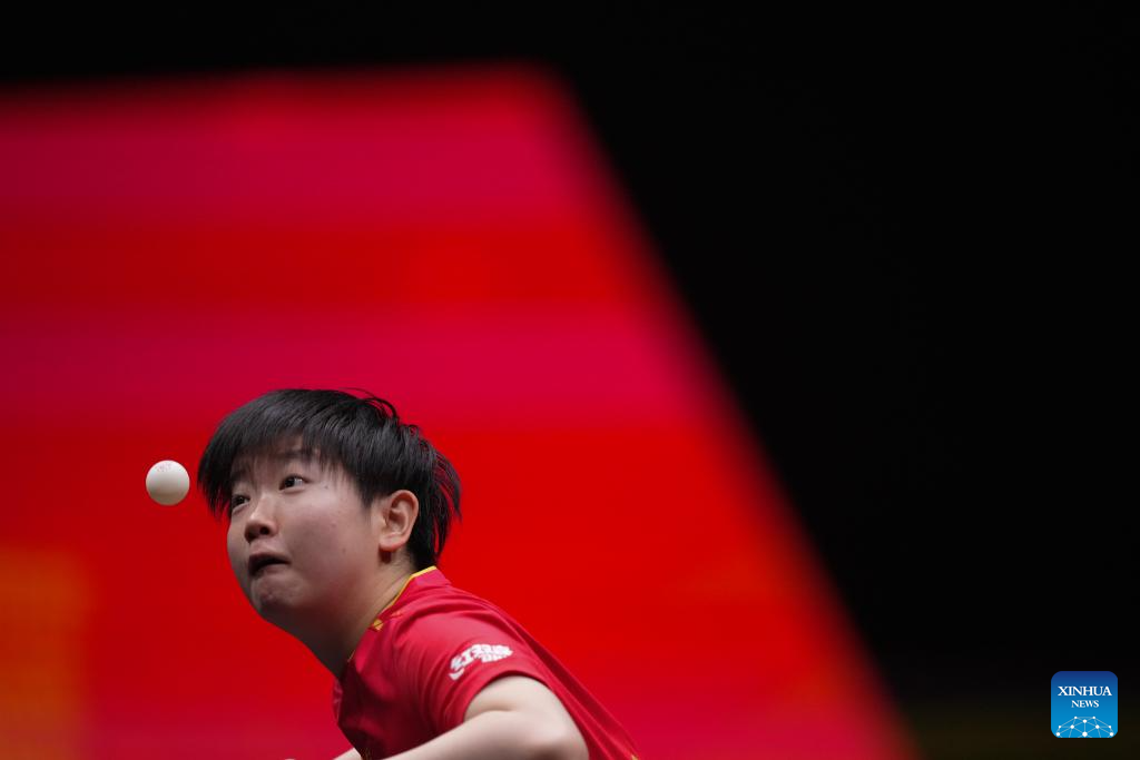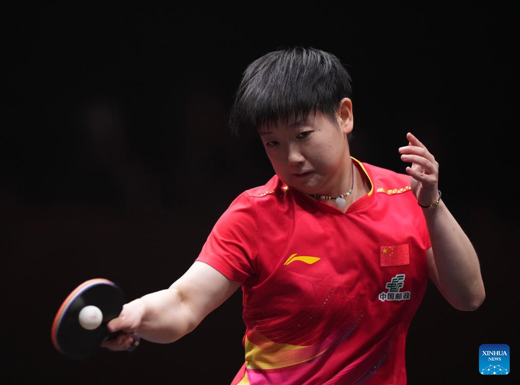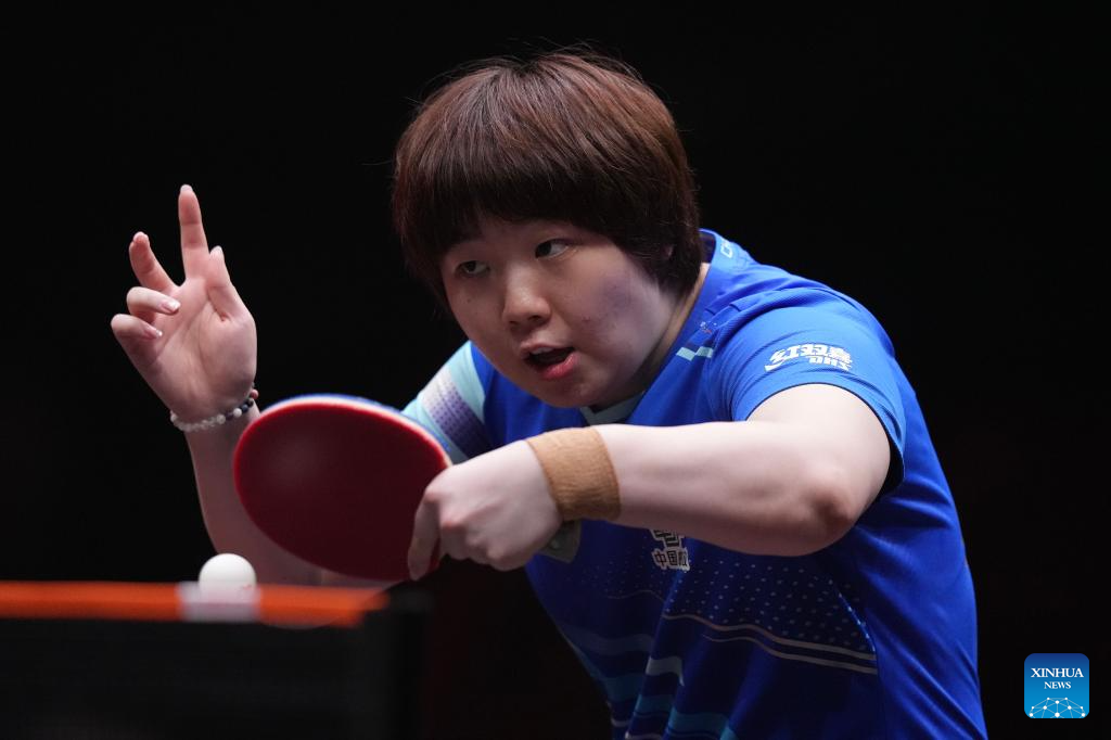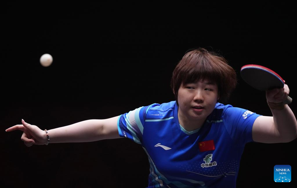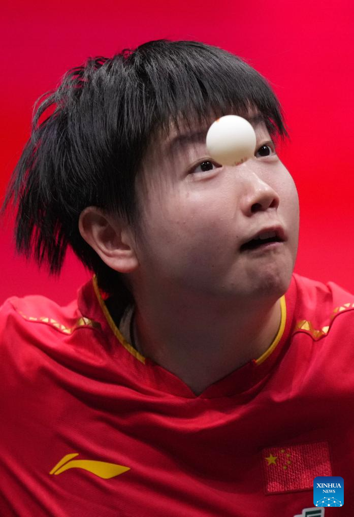 Sun Yingsha competes during the women's singles semifinal match between Sun Yingsha of China and Kuai Man of China at the WTT Finals Hong Kong 2025 in Hong Kong, south China, Dec. 13, 2025. (Xinhua/Lui Siu Wai)