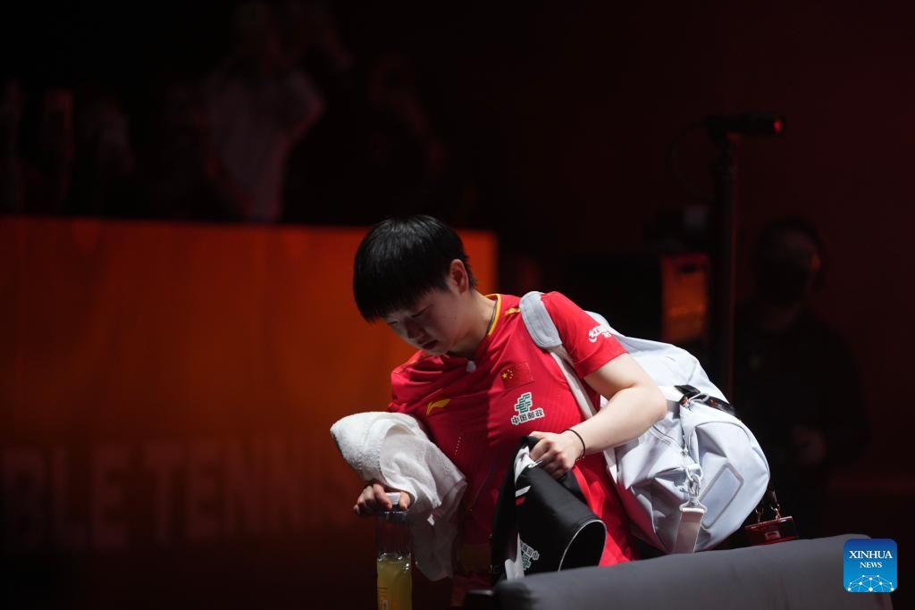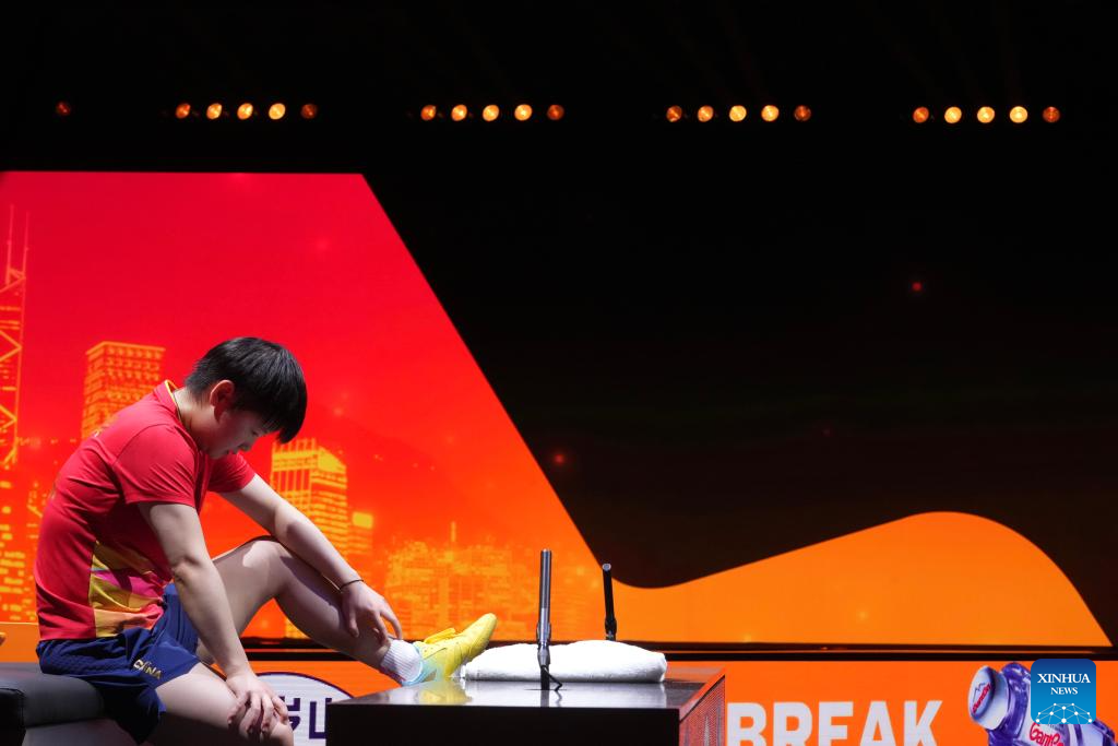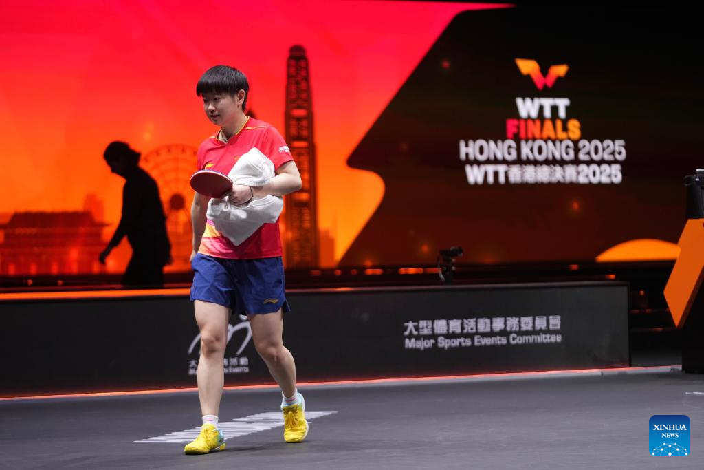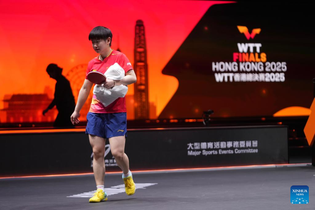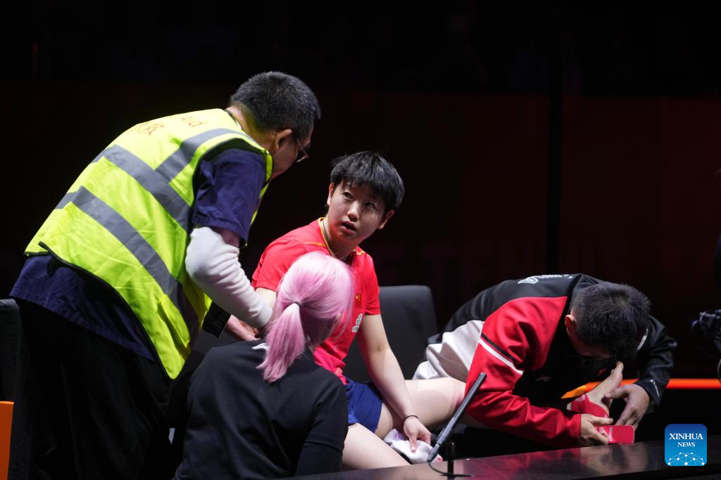 Sun Yingsha retires from the match due to injury during the women's singles semifinal match between Sun Yingsha of China and Kuai Man of China at the WTT Finals Hong Kong 2025 in Hong Kong, south China, Dec. 13, 2025. (Xinhua/Lui Siu Wai)