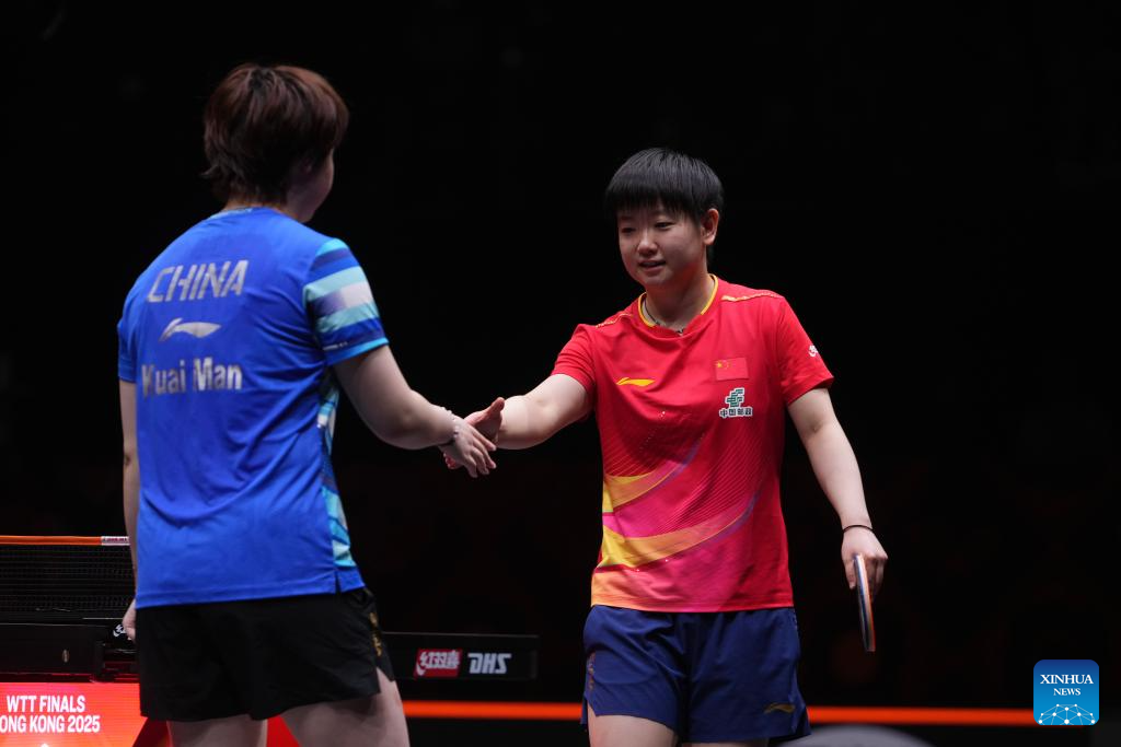 Sun Yingsha (R) shakes hands with Kuai Man during the women's singles semifinal match between Sun Yingsha of China and Kuai Man of China at the WTT Finals Hong Kong 2025 in Hong Kong, south China, Dec. 13, 2025. (Xinhua/Lui Siu Wai)