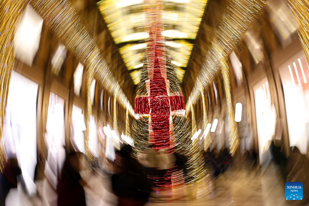 Festive lights are seen at Galleria Alberto Sordi in Rome, Italy, Dec. 13, 2025. (Xinhua/Li Jing)
