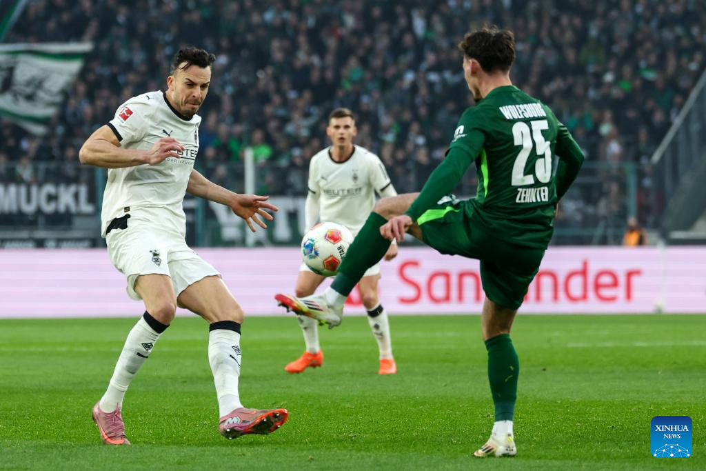 Philipp Sander (L) of Borussia Moenchengladbach vies with Patrick Wimmer of VfL Wolfsburg during the German first division of Bundesliga football match between Borussia Moenchengladbach and VfL Wolfsburg in Moenchengladbach, Germany, Dec. 13, 2025. (Photo by Joachim Bywaletz/Xinhua)