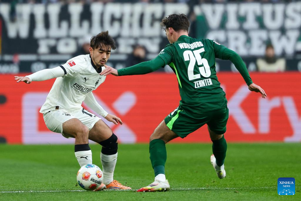 Luca Netz (R) of Borussia Moenchengladbach vies with Mohammed Amoura of VfL Wolfsburg during the German first division of Bundesliga football match between Borussia Moenchengladbach and VfL Wolfsburg in Moenchengladbach, Germany, Dec. 13, 2025. (Photo by Joachim Bywaletz/Xinhua)