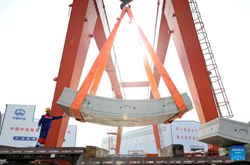 A worker screws a bolt tight at the construction site of the Chongming-Taicang tunnel, part of the Shanghai-Chongqing-Chengdu High-Speed Railway, under Yangtze River, on Dec. 16, 2025. The ongoing excavation of the tunnel under Yangtze River, carried out by the world's largest diameter high-speed rail shield tunneling machine the "Linghang" that is independently developed by China, has exceeded the 10,000-meter mark on Tuesday, which laid a solid foundation for the completion of the tunnel.