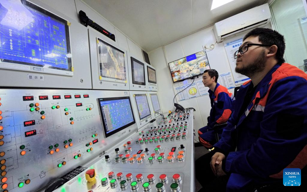Workers monitor the tunneling operation data at the control room of the "Linghang" large diameter shield tunneling machine at the construction site of the Chongming-Taicang tunnel, part of the Shanghai-Chongqing-Chengdu High-Speed Railway, on Dec. 16, 2025. The ongoing excavation of the tunnel under Yangtze River, carried out by the world's largest diameter high-speed rail shield tunneling machine the "Linghang" that is independently developed by China, has exceeded the 10,000-meter mark on Tuesday, which laid a solid foundation for the completion of the tunnel.
