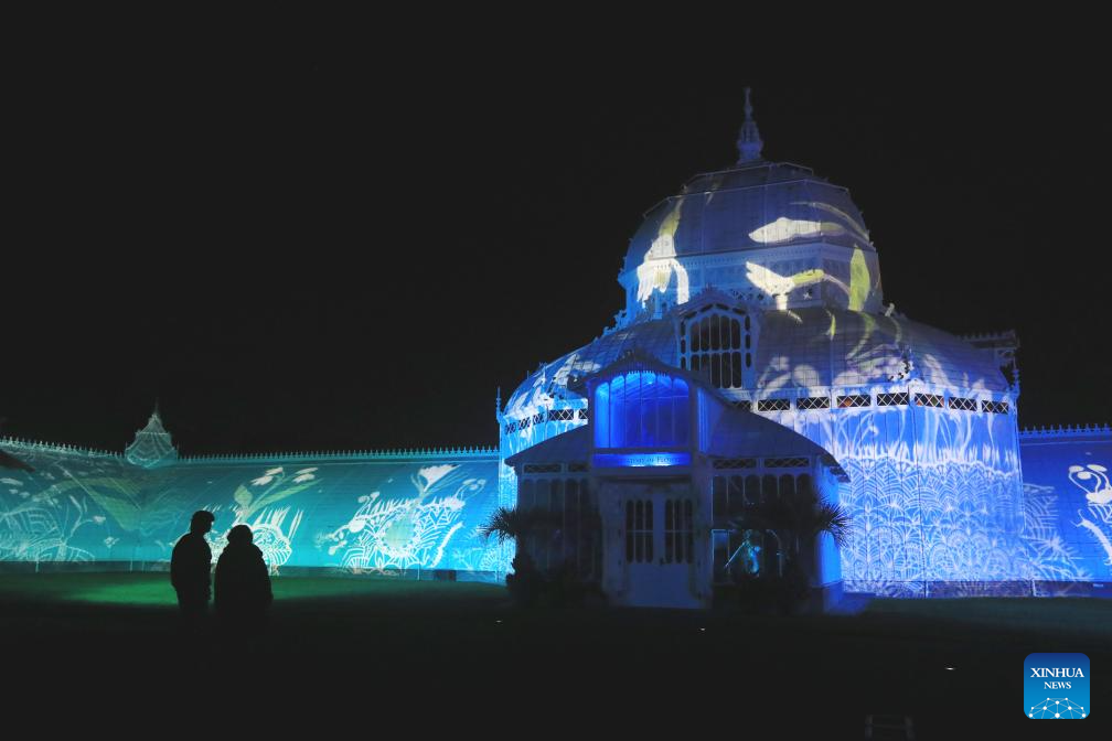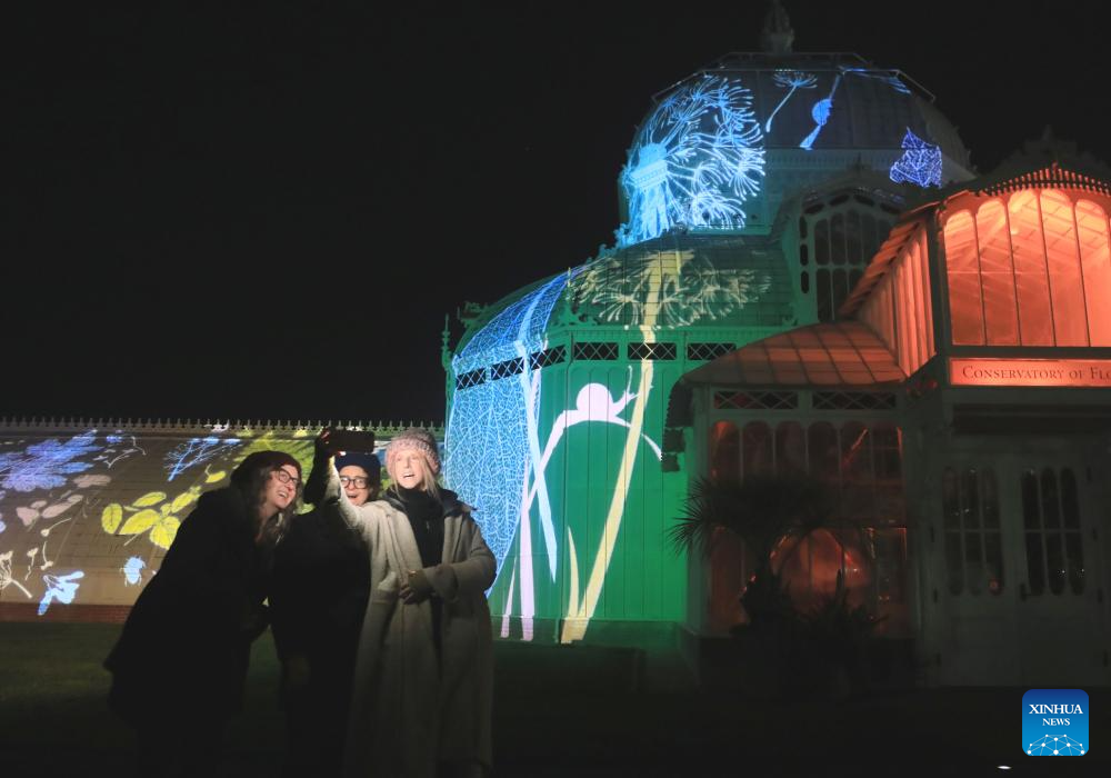 People watch a light show at the Conservatory of Flowers in Golden Gate Park of San Francisco, the United States, Dec. 15, 2025. (Photo by Liu Yilin/Xinhua)