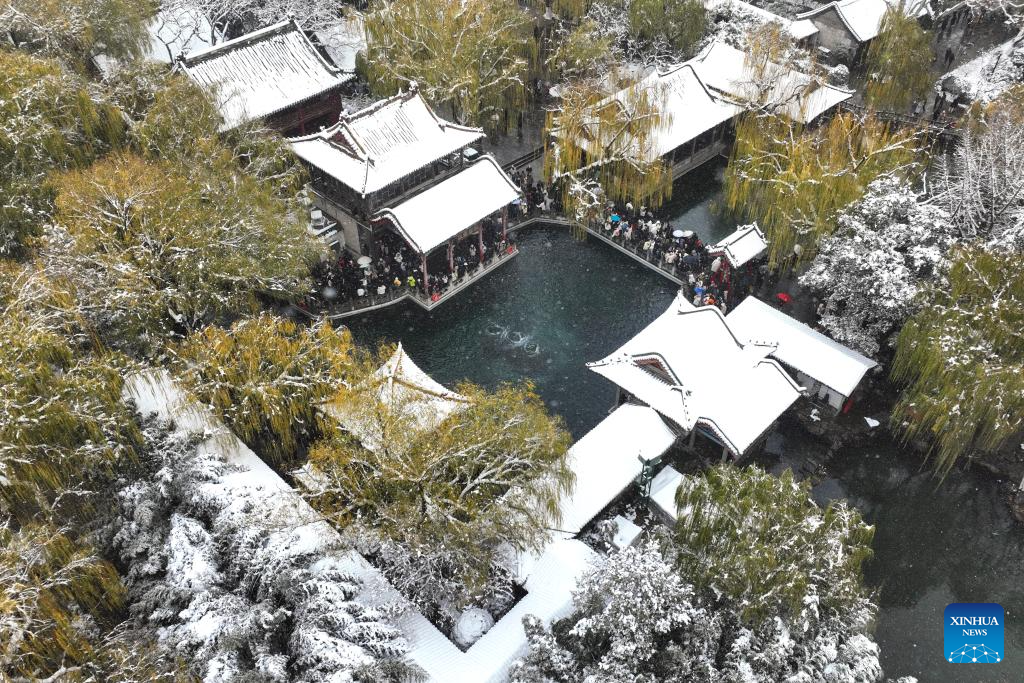 A drone photo taken on Dec. 13, 2025 shows people enjoying snowy scenery at Baotu Spring Park in Jinan, east China's Shandong Province. (Photo by Hao Xincheng/Xinhua)