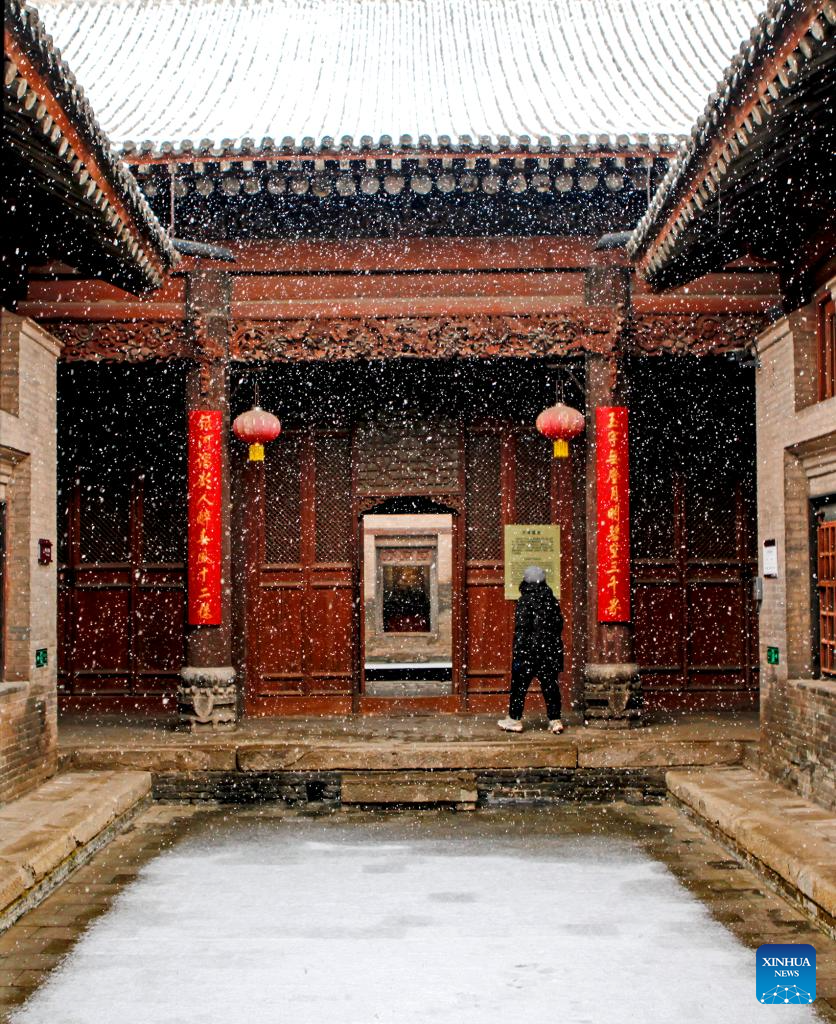 A tourist visits a folk custom museum amid snowfall in Dingcun Village, Linfen City of north China's Shanxi Province, Dec. 12, 2025. (Photo by Li Xianjun/Xinhua)