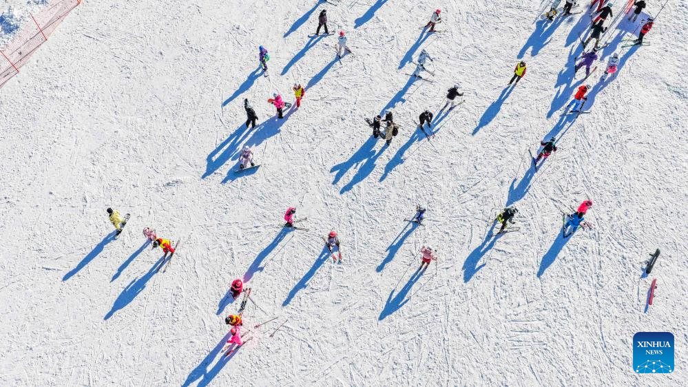 An aerial drone photo taken on Dec. 7, 2025 shows tourists skiing at the Yulongwan ski resort in Yutian County, Tangshan City of north China's Hebei Province. (Photo by Liu Mancang/Xinhua)