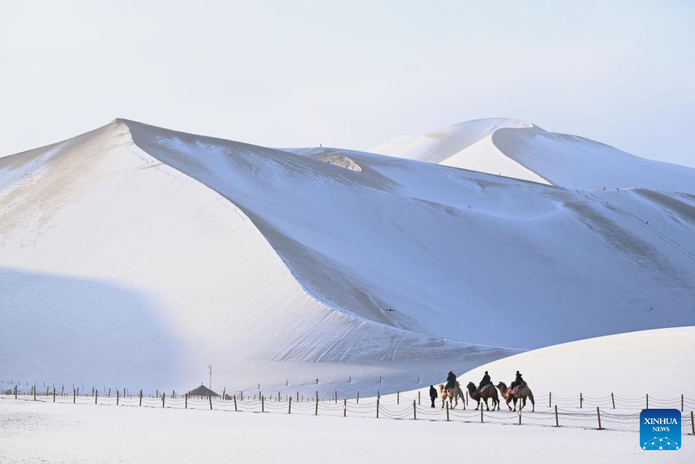Tourists ride camels to enjoy the snowy scenery at the Mingsha Mountain and Crescent Spring Scenic Area in Dunhuang City, northwest China's Gansu Province, Dec. 12, 2025. (Photo by Zhang Xiaoliang/Xinhua)