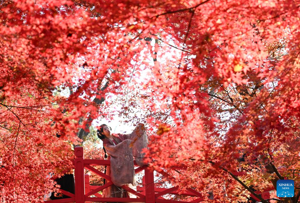 A tourist enjoys maple leaves at Zhongshan Botanical Garden in Nanjing, east China's Jiangsu Province, Dec. 7, 2025. (Photo by Yang Suping/Xinhua)