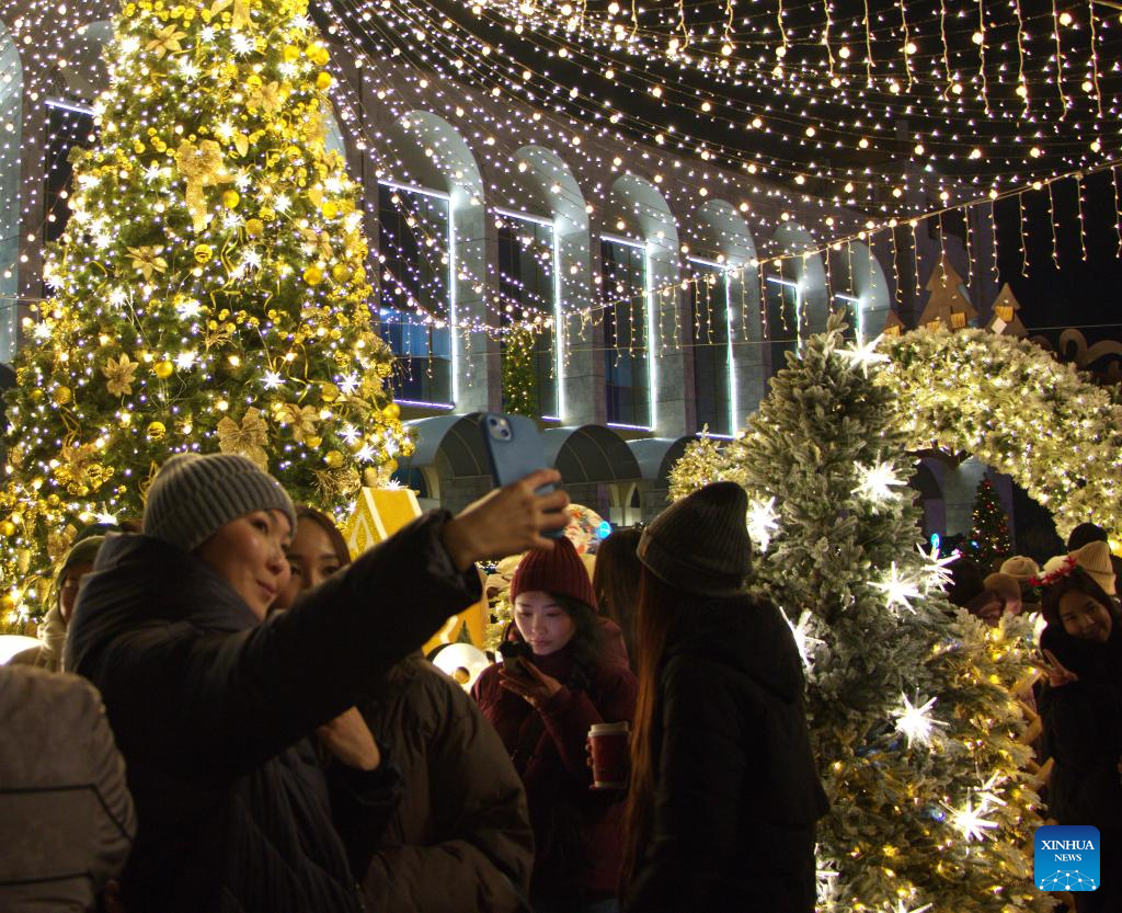 People take photos during the New Year tree lighting ceremony in Bishkek, Kyrgyzstan, Dec. 15, 2025. (Photo by Liu Xiaowan/Xinhua)