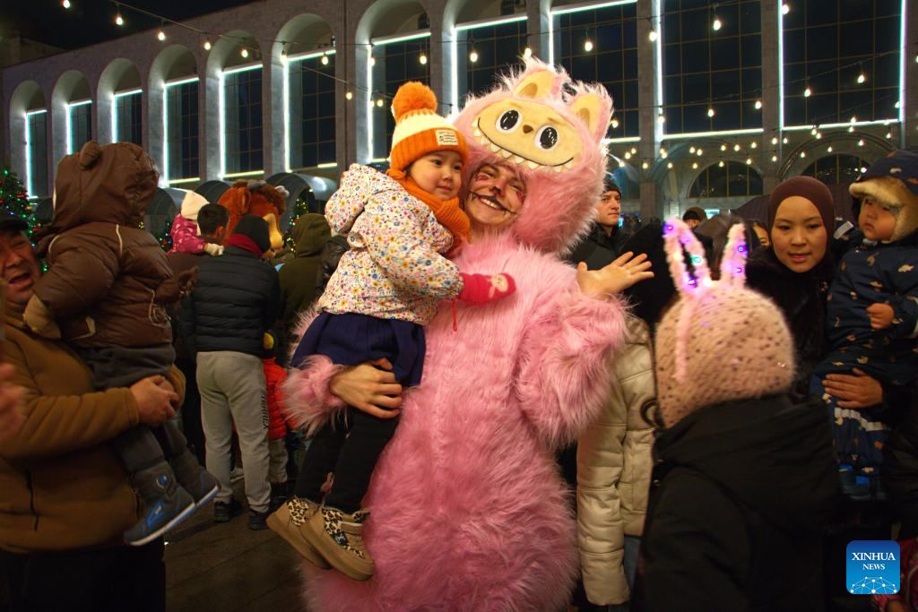People attend the New Year tree lighting ceremony in Bishkek, Kyrgyzstan, Dec. 15, 2025. (Xinhua/Jiang Youlin)