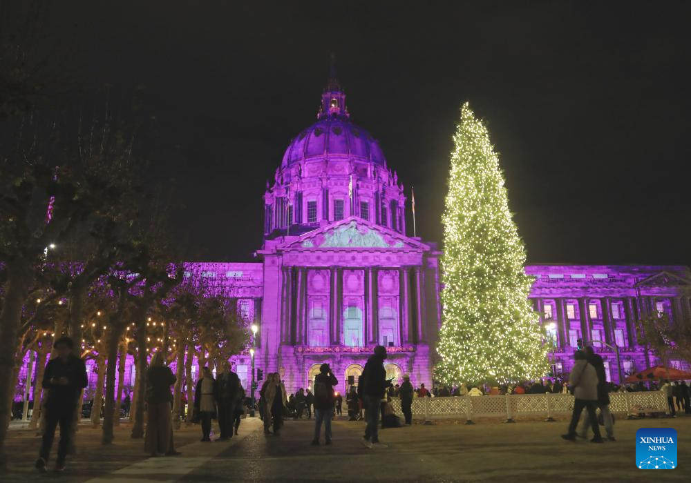 People enjoy the "City Hall Winter Lights" show outside the City Hall in San Francisco, the United States, Dec. 16, 2025. (Photo by Liu Yilin/Xinhua)