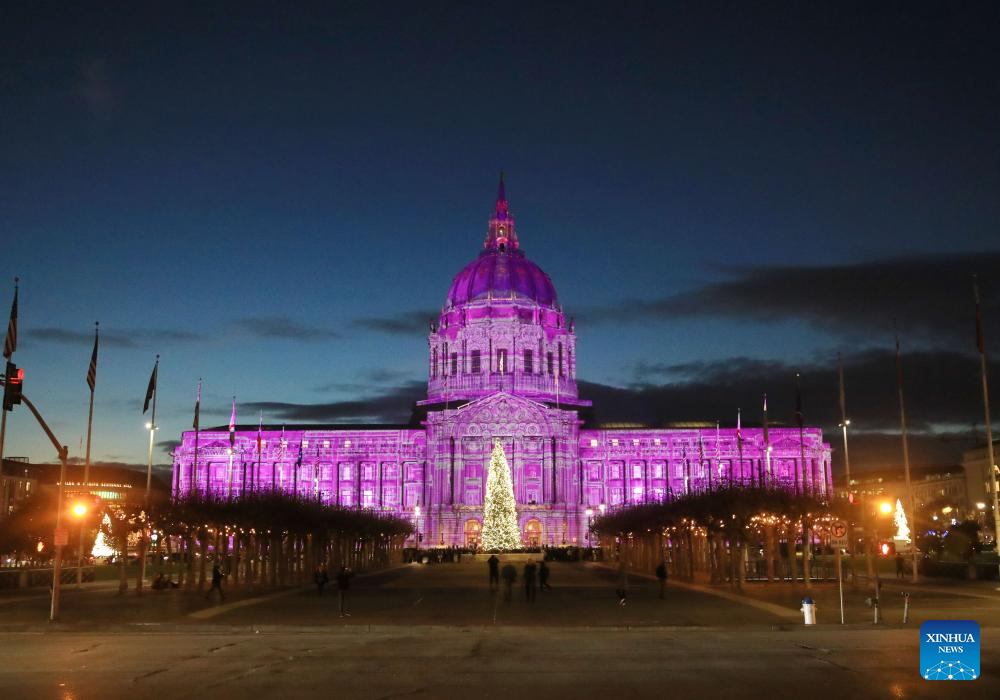 The "City Hall Winter Lights" show is staged outside the City Hall in San Francisco, the United States, Dec. 16, 2025. (Photo by Liu Yilin/Xinhua)