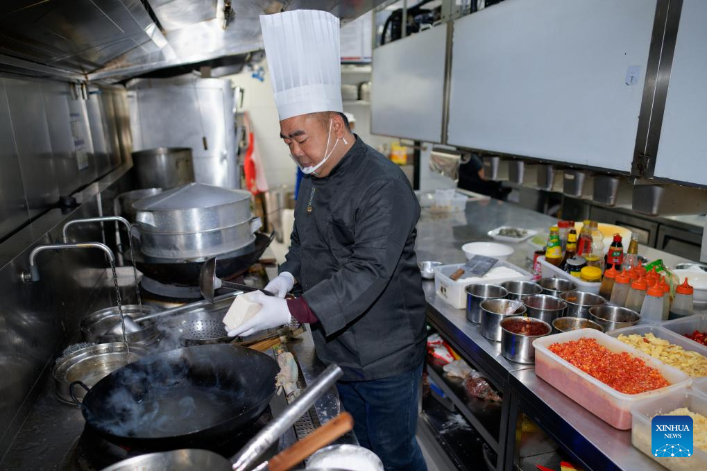 A chef prepares tofu dishes at a restaurant in Jian'ge County of Guangyuan City, southwest China's Sichuan Province, Dec. 13, 2025. (Xinhua/Lian Zhen)