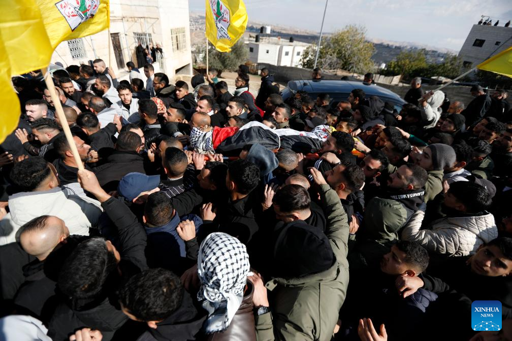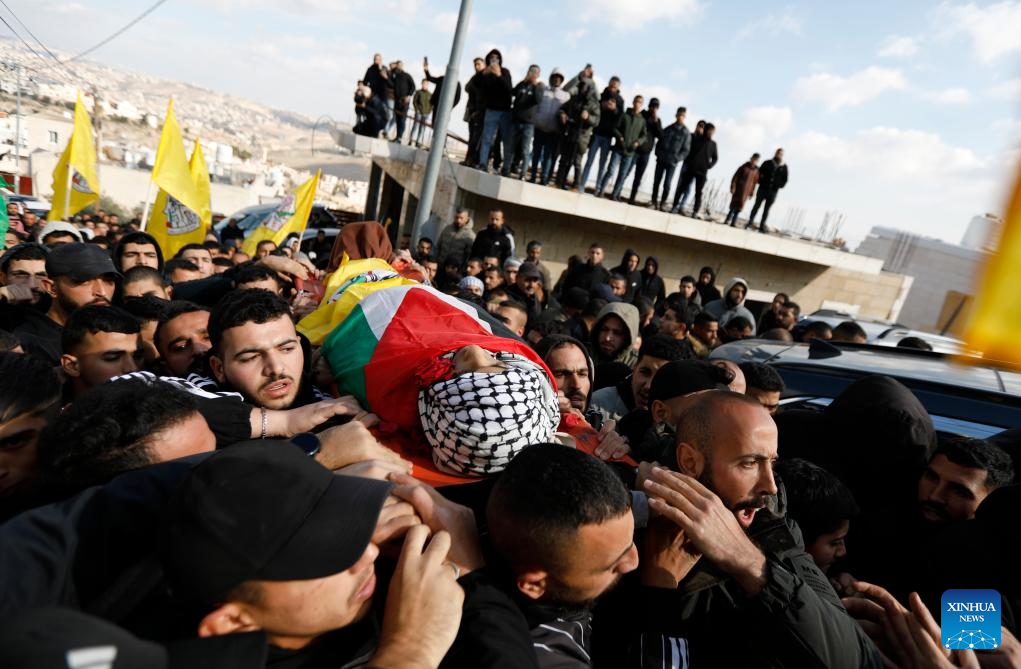 Mourners carry the body of Palestinian boy Ammar Ta'amra, who was shot dead by Israeli army, during his funeral in the town of Tuqu', southeast of Bethlehem in the West Bank, on Dec. 16, 2025. The 16-year-old Palestinian, Ammar Ta'amra, was shot dead, by the Israeli army during a military raid on Tuqu' on Monday, the Palestinian health ministry said. (Photo by Mamoun Wazwaz/Xinhua)